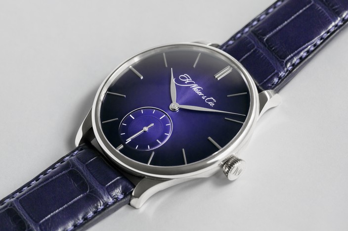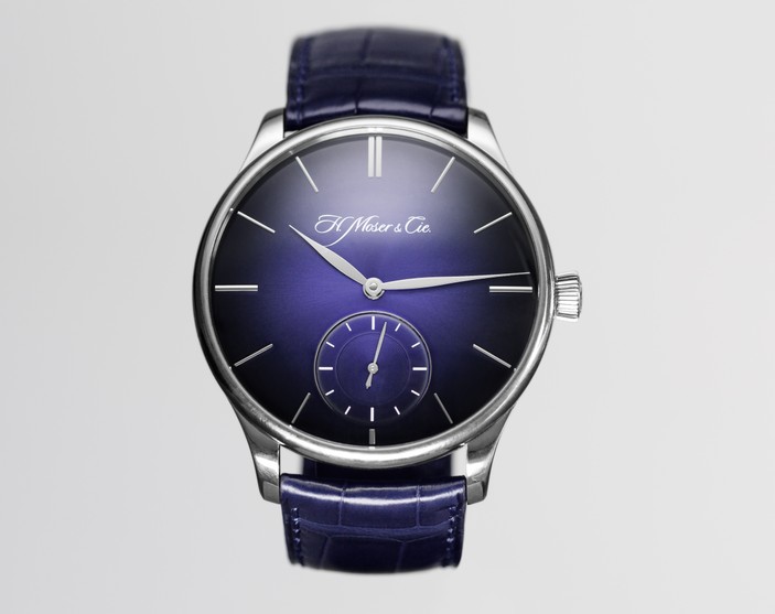 Strap hand-sewn midnight blue alligator strap Pure 18K white gold pin buckle engraved with Moser logo